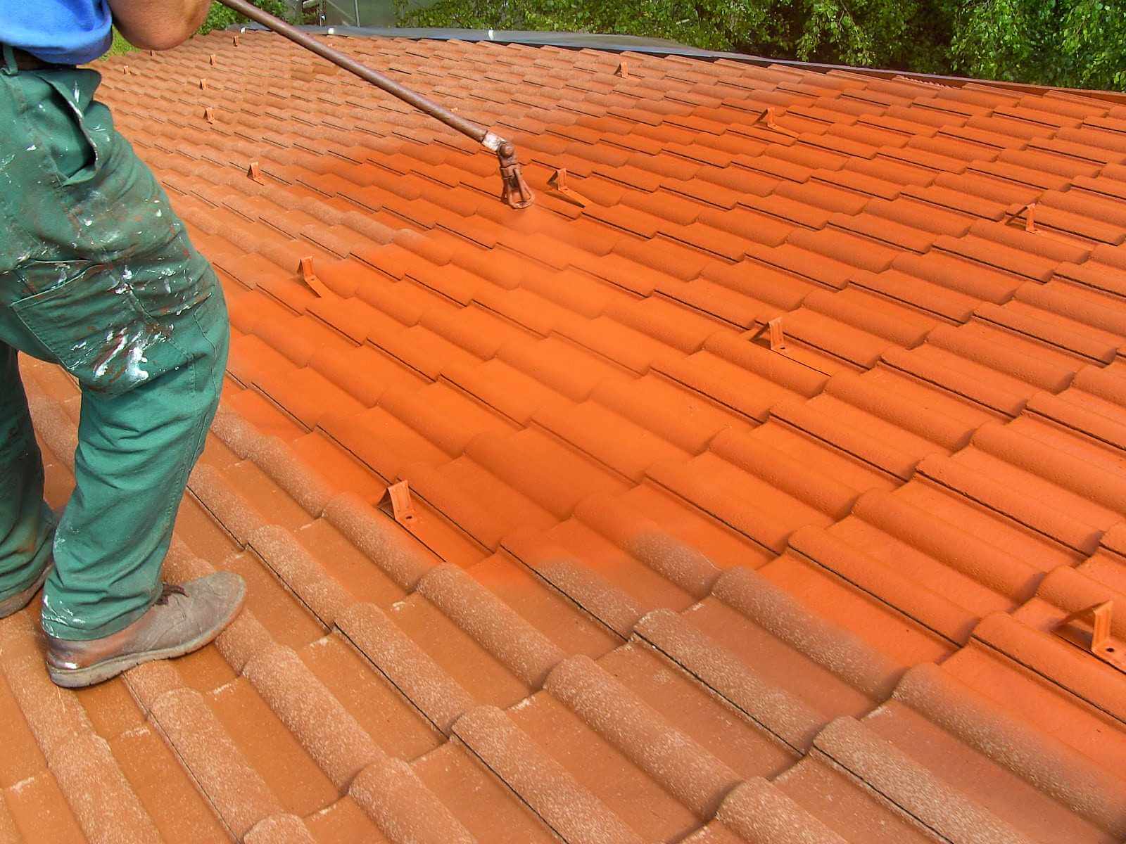Pose d’un produit imperméabilisant qui protège la toiture contre l’humidité et les infiltrations.